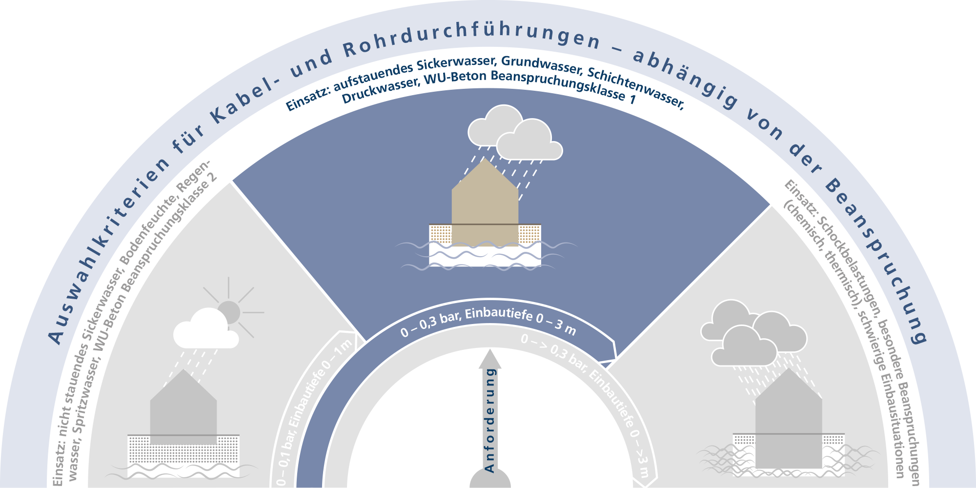 • Nicht stauendes Sickerwasser, WU-Beton Beanspruchungsklasse 2, Aufstauendes Sickerwasser, Druckwasser, WU-Beton Beanspruchungsklasse 1